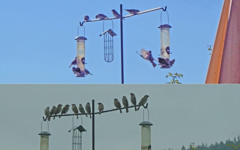 Weil sie das ganze Jahr über gefüttert werden, sorgen bei Regen und Sonnenschein Heerscharen von Spatzen für ein Gratis-Fernsehprogramm.