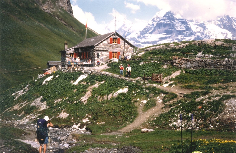 Aufbruch von unserem letzten Lager, aber auch Abschied von Liselotte, die nun doch hier abbrechen will. Wir andern machen uns auf den Weg, der uns fast unter den Engstligen-Fällen hindurch führt. Jedenfalls bleibt keiner lange stehen auf der Brücke, denn so lieblich stäubt er nun doch wieder nicht, der reine Strahl, der von der hohen steilen Felswand strömt, wie Herr Goethe sagte. Das Wandern durch taufrischen Morgenwald, mit dem Gesang der verschiedenen Vogelstimmen, ist Balsam für die Seele. Aber nicht nur um mich her ist ein Singen, auch in mir drin ist ein gutes und positives Gefühl. Ich meine, ich spüre mich selber und im Moment liebe ich meine Wirklichkeit, wie es im letzten Vers des Gedichtes heisst, welches ‘schuld‘ war, dass ich diese Wanderung mitmachen durfte.