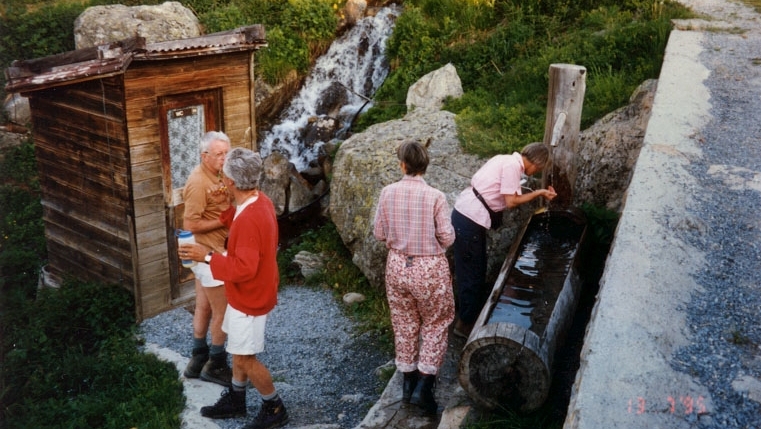 Dort baden die ersten schon ihre Füsse im kühlen Brunnentrog und es dauert nicht lange, so darf dieser sogar einem ganz Unerschrockenen als Badewanne dienen. Für die grosse Toilette hat man ausser dem Brunnen noch eine zweite Waschgelegenheit im obern Teil des Häuschens, in welchem sich unten zwei fliegenumschwirrte Plumpsklos befinden. Die Tücken dieses Erleichterungskabinetts liegt für mich als Bergbanause eigentlich nicht bei der runden Öffnung, sondern eher bei diesem blöden Querbalken auf Schienbeinhöhe der Tür. Weil man während der Benützung den Atem anhalten muss, sorgt nämlich dieser Balken für eine blitzartige Beförderung ins Freie, wo man dann am Boden die würzige Alpenluft wieder voll in seine Lungen einsaugen kann.
