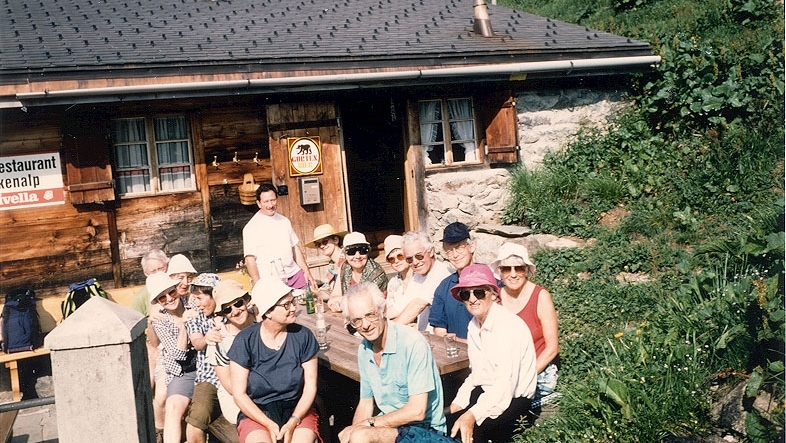 Zwanzig Wanderlustige haben sich für die Wanderwoche 1995 angemeldet. Im reservierten Abteil in Basel vorerst noch zögernde Beschnupperungsversuche mit der krampfhaften Bemühung, mir all die fremden Gesichter mit den dazugehörigen Namen einzuprägen. Mit Erleichterung stelle ich fest, dass ich nicht allein Neuling bin in dieser Gruppe. Elisabeth, Ruth und Peter waren auch noch nie mit dabei und in Olten steigen Vreni mit Babsy und Christiane zu. Vreni gehört allerdings schon zum harten Kern und sie hat bei Christiane und Ruth heftig Werbung gemacht. Irgendwann ist auch plötzlich Bea aus Romanshorn, die Tochter von Hans Mory bei uns. Ein Teilnehmer musste im letzten Moment passen, weil er krank wurde.