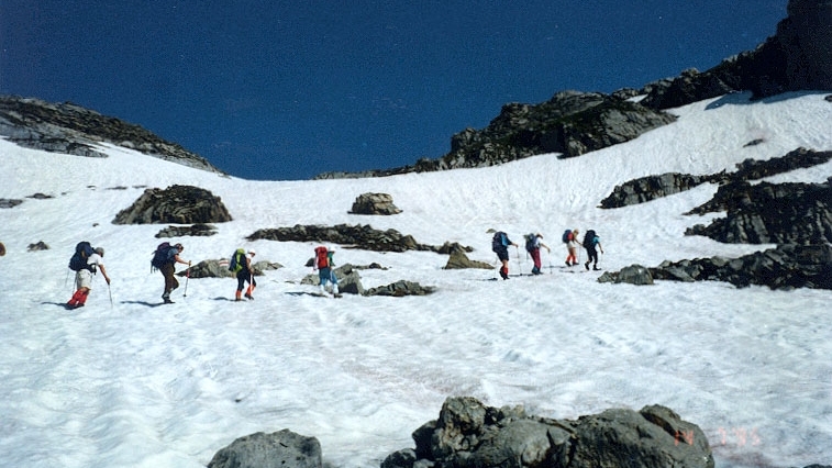 Bei einer Verschnaufpause kurz vor dem letzten steilen Stück auf einem aperen Felsen, schaue ich einmal zurück zum Schilthorn und dem herrlichen blauen Seelein Hinderem Horn. Zu meinem Schreck sehe ich jemanden von uns mühsam das Schneefeld hinansteigen um wieder zum Pfad zu gelangen. – Ist jemand abgestürzt? Aber allem Anschein nach ist nichts passiert. Das apere Stück ist nicht sehr gross, aber zum Teetrinken reicht’s. Nun kommt auch Hans und an unseren angstvollen Gesichtern sieht er wahrscheinlich, dass es Zeit ist, einmal richtige Instruktionen zu erteilen, wie man sich auf einem Schneefeld verhalten muss, wenn man ins Rutschen gerät und er rennt einfach so drauflos in den Schnee hinein. An diesem steilen Hang! Mir steht fast das Herz still. Er dreht sich schnell, so dass er sich mit den Fussspitzen und den Händen im Schnee auffangen kann. Also Bauch unten, aber nicht liegen. Er macht es zwei, dreimal vor und es scheint zu funktionieren. Es hat sein Gutes, dass er sich im Schneefeld so wohl fühlt, denn bevor wir weitermarschieren, muss er noch einen Rucksack heraufholen, der selbständig ausprobieren wollte, ob der eben vorgeführte Trick für ihn auch funktioniere – eben Rücken nach oben!