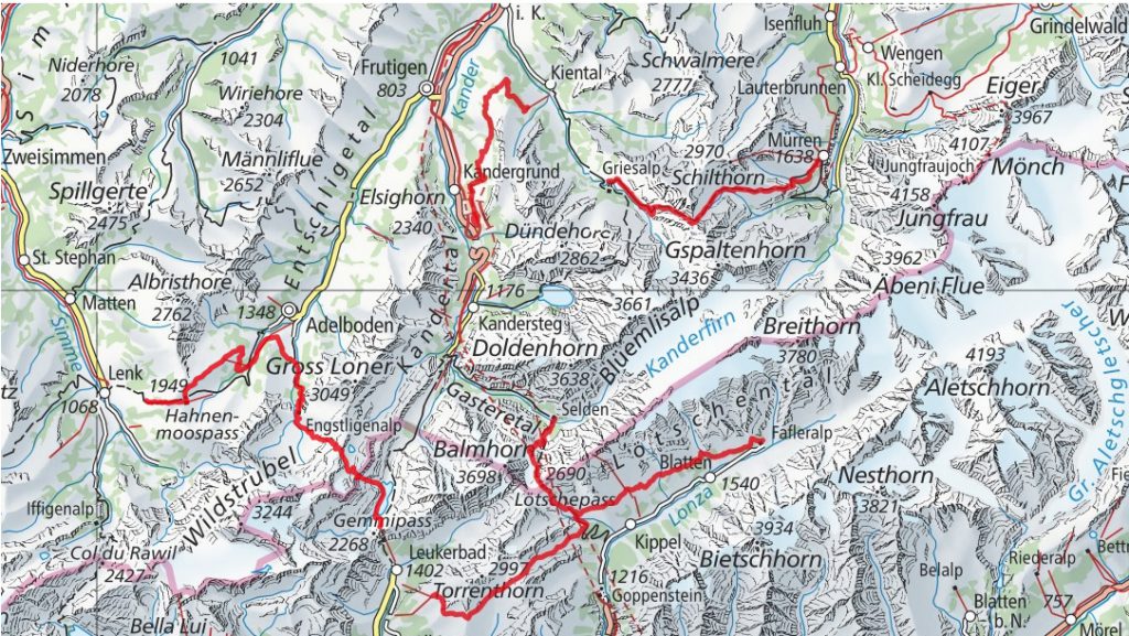 Leise schaukelnd hebt uns der Sessellift durch die friedliche Morgenstille empor nach Ramslauenen. Einzig der Gesang eines Goldhähnchens begleitet unser Schweben. Wieder auf den Füssen, beginnt unser Weg über die Nordrampe der BLS zuerst mit einem kurzen viertelstündigen Aufstieg. Alsdann zieht sich der Weg mehr oder weniger auf gleicher Höhe durch Wald und Alpweiden dem Kiental entlang, bis wir dem Hunds- und Gpaltenhorn und dem weissen, hohen Schneefeld über welches der Weg übers Hohtürli geführt hätte, ade sagen können. Dafür öffnet sich uns das Kandertal mit Frutigen und seinen Gleisanlagen der Lötschberg-Nordrampe der BLS. Balmhorn und Altels begrüssen uns von weitem. Kaum zu glauben, dass wir uns übermorgen weit hinter deren Rücken befinden werden.