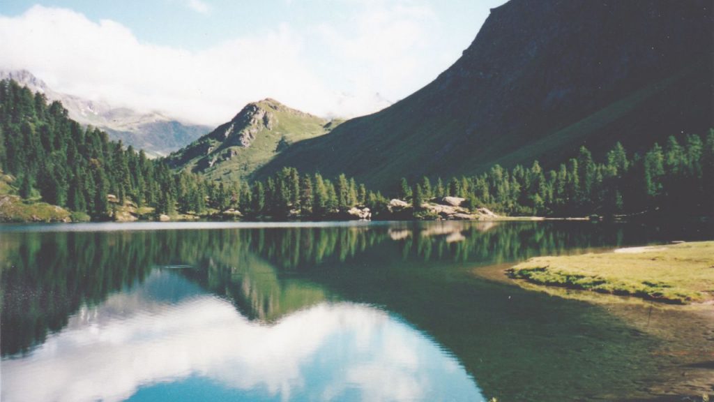 In Sfazù wartet das bestellte Minibus-Postauto. Noch können wir wählen, bis wo wir mitreiten wollen. Am besten bis an die Sonne. Aber da kann uns der Chauffeur nicht dienen und wir sind einverstanden, dass er uns nach Camp führt. Von dort sind es zum Lagh da Saoseo, dem beschwärmten, nur 20 Minuten durch lichten Wald auf relativ ebenem Pfad. Bis zum entscheidenden Wegweiser.