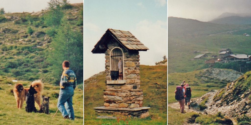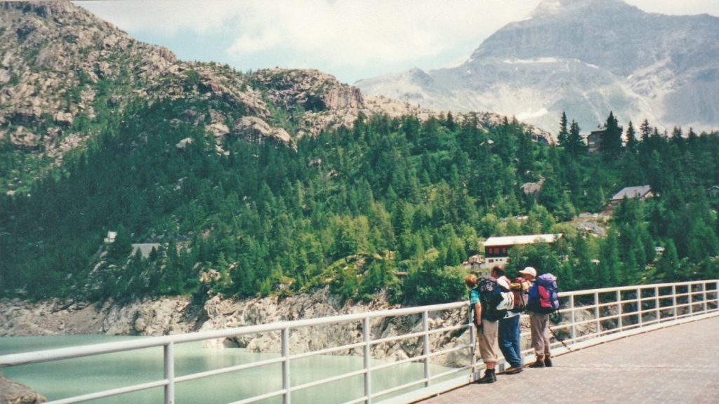 Ausgedehnt können wir hoch über der Alpe Foppa Mittagsrast halten. Wir haben uns heute an den Weg gehalten, so dass wir mit nur etwa drei Marschstunden rechnen müssen. Trotzdem können wir schon um drei Uhr von der Staumauer des Lago di Campo Moro aus auf unsrige heutige Etappe zurückblicken. Im Rifugio Campo Moro, welches genau auf 2000 m liegt, lässt sich’s gemütlich sein. Wir haben Hotelzimmer und ich teile mit Vreni ‚un letto matrimoniale‘. Und eigene Dusche! Nur hat sich wahrscheinlich eine Kröte in die Leitung verirrt. Die letzten haben es gerade noch geschafft zu duschen, und dann war‘s es. Hoffentlich hat die Küche vorgesorgt. Ausser uns bewirten sie nämlich noch eine grosse Gruppe Konfirmanden. Jedenfalls putzen wir die Zähne heute mit Mineralwasser.