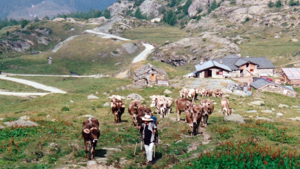 Im Gegensatz zu der Schweizerseite ist der Weg in Richtung Val Malenco relativ gut ausgebaut. Ist es wohl, um die Hütte bei Punkt 2575 (ein Grenzposten?) besser oder eventuell zu Pferd zu erreichen? Uns und unsern Knien kann es ja recht sein. Bald empfangen uns die Alpweiden mit Alpenastern in ihrer Blumenpracht. Weidendes Vieh stellt sich uns in den Weg und wer nicht genügend Abstand einhält, fasst einen veritabeln Backenstreich von einem wehenden Kuhschwanz. Weiter unten am Weg, wie als Anschauungsmaterial ausgestellt, ein Gerippe, abgenagt von Geiern und Käfern. Vorderbeine und Kopf fehlen. Als Laie kann man nicht feststellen, ob es nun mal ein Rind war, oder ein prächtiger Steinbock oder Hirsch. Möglich, dass auch eine Lawine sein Schicksal besiegelt hat und seine Überreste aus dem schmelzenden weissen Grab freigegeben wurden. So wie wir vor drei Tagen im Susascatal vor den Resten eines riesigen Lawinenkegels standen. Der Bach hatte sich ein Loch gebohrt und floss in einem Tunnel jetzt im Juli noch immer unter einer etwa fünf Meter hohen Schicht aus Schnee, Holz, Tannästen und Steinen hindurch. In der Luft lag ein Hauch von Verwesung. Auch dort fanden wir das Gerippe eines Wildtiers.