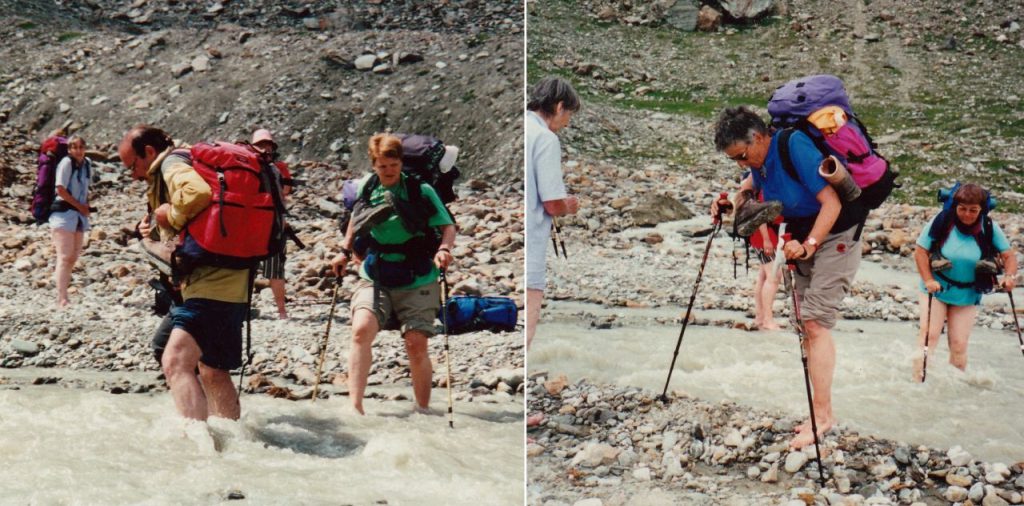 Liselotte zeigt wie’s geht: Hosenbeine hochgestülpt und die Schuhe an den Bändeln zusammengebunden um den Hals gehängt und hinein ins eisig kalte Nass. 200 Meter vom Gletscher-Ausfluss entfernt! Brrrr! Es gibt nichts anderes für uns, als auch Augen zu und durch! Das heisst, so ganz blindlings geht’s doch nicht. Es reisst und nadelt und sandstrahlt. Ich bin froh um meine Stöcke, die mir etwas Sicherheit verleihen. Krebsrot sind die Füsse aber noch ehe sie wieder trocken sind, sind sie auch schon wieder schön warm und also erfrischt wandern sie weiter über Stock und Stein. Waren die Wiesen vorhin weiss von Margriten, sind sie jetzt von gelben Blumen übersät.  Mitten in der gelben Pracht steht wieder ein Grenzstein, der uns in die Schweiz lässt. Pass da Cancian heisst es hier. Werden wir wohl auf unserer Wanderung auch beobachtet um sicher zu gehen, dass wir weder Schlepper noch Pass- und heimatlose Flüchtlinge sind und die Grenze auch wirklich am rechten Ort überschreiten?