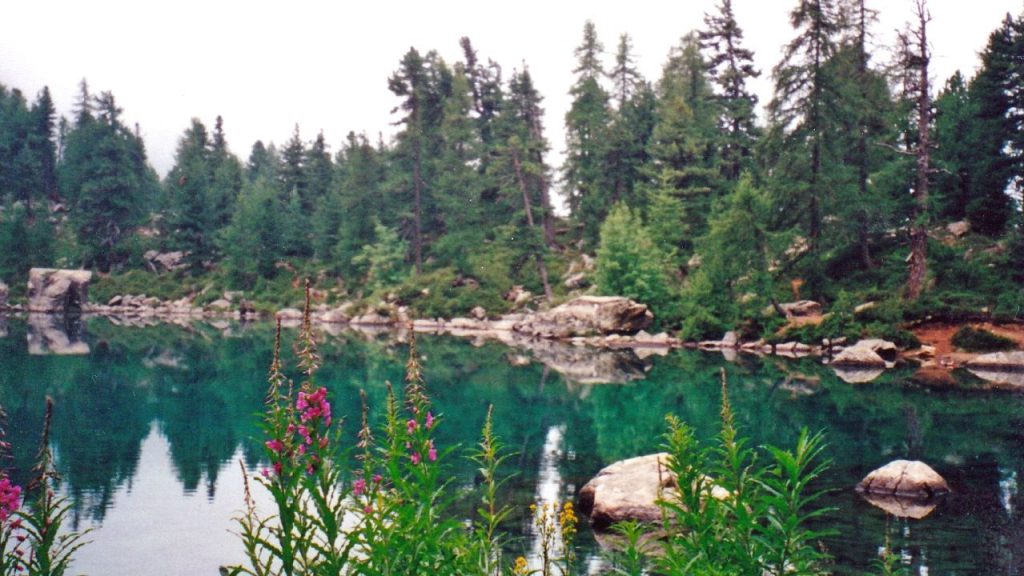 Den Saoseosee sehen, heisst ein Ab- und wieder Aufstieg von fast hundert Metern. Ich will es mir nicht nehmen lassen, noch sind wir ja frisch eingelaufen. Hans möchte seinen Knien doch nicht unnötige Abstiege zumuten und entscheidet sich, den Höhenweg bis zum Lagh da Val Viola beizubehalten. Liselotte begleitet ihn. Bald präsentiert sich uns der wunderbare Bergsee mit seinem glasklaren, ruhigen Wasser wie ein riesiger Spiegel. Geheimnisvoll und doch durchschaubar bis zum Grund. Rastplätze mit Bänklein laden zum Verweilen und Träumen ein. Der Abstecher hat sich absolut gelohnt. Langsam beginnt aber auch unser Weg geheimnisvoll zu werden. Nebelfetzen beginnen die Tannenwipfel einzuspinnen, mehr und mehr verschlucken sie die Umgebung und statt zum Lagh da Val Viola zu kommen, stranden wir am Nebelmeer. Wie finden wir nun Hans und Liselotte? Wir rufen einfach mal dem Uhu. Er antwortet sogar! Sie haben den See noch gesehen. Hans hat sogar das Glück gehabt und konnte die kleine Meerjungfrau auf dem Stein fotografieren.