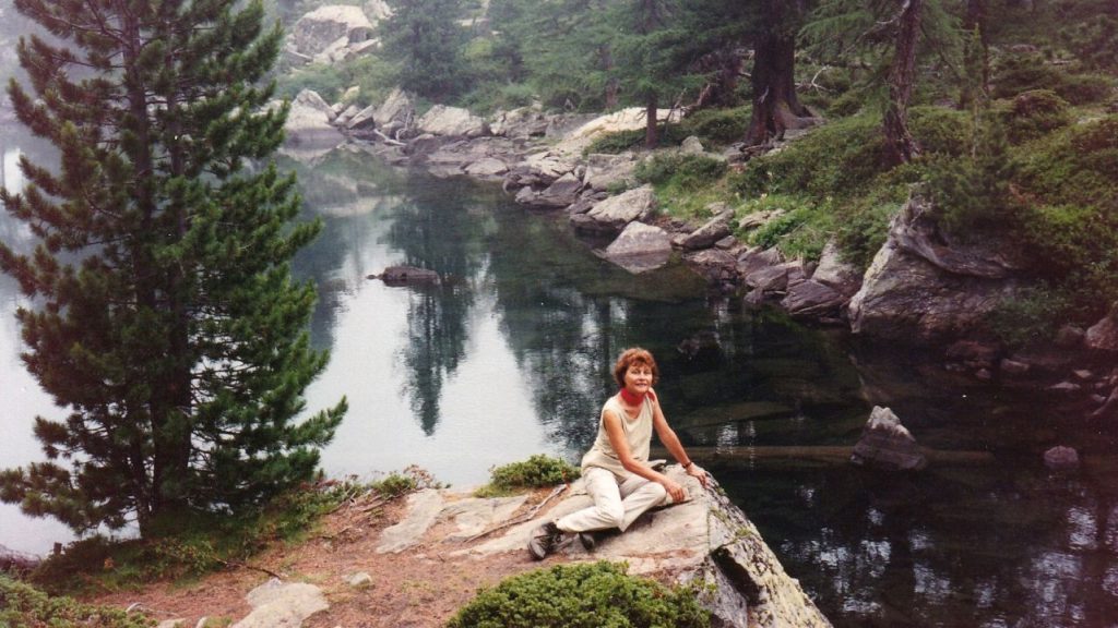 Beim ersten Stundenhalt wird die wunderbare Aussicht ins Val Malenco nochmals genossen und Hans will bestätigt haben, dass sein Handy von hier aus auch funktioniert. Von nun an geht’s heute nur noch abwärts. Zuerst über eine Weide mit Arnika und Männertreu übersät, später über ausgefahrene Skipisten, bis uns ein gut ausgebauter, weicher Waldweg in ein malerisches Tal führt. Bald führt uns der Pfad wieder an hohen Felswänden vorbei zum Eingang einer engen Schlucht. So felsig und eng, dass gerade Rosmarie‘s Schuh in einer Felsspalte stecken bleibt und er mit vereinten Kräften (was wären wir ohne Männer!) daraus befreit werden muss. Ganz sanft und rund hat hier das Wasser des kleinen Baches, der uns durch die Engnis führt, die Felsen in tausenden von Jahren geschliffen. Geheimnisvoll und entzückend ist es durch diese einsame Welt zu wandern.