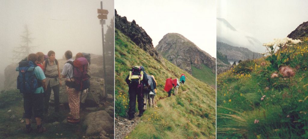 Die Wirtin hat uns heute morgen erklärt, dass der Weg, den wir über den Pass nehmen wollen, hier bei der neuen Hütte weiter geht. Also gehen wir mal auf die Suche nach diesem Haus. Ein Gebäude finden wir allerdings nirgends, dafür begegnen wir Rosmarie und Lydia, welche den Lagh da Val Viola vom Saoseosee aus von der gegenüberliegenden, steileren Seite her angepeilt haben. Glücklich vereint aber nur, um uns zu verabschieden. Eigentlich wollte Regula heute noch im Rifugio Val Viola übernachten, und morgen den Heimweg durchs Val da Camp zurück unter die Füsse nehmen. Das Wetter hat ihr die Entscheidung etwas leichter gemacht und sie hat sich entschlossen, hier umzukehren. Vreni will sie begleiten. Bereits fallen erste Regentropfen und gönnen uns nicht mal eine kleine Rast um den Motor für den bevorstehenden Aufstieg genügend einzuheizen. Bunte Regenhosen und Pelerinen kommen aus den Tiefen der Rucksäcke zum Vorschein und bald verschwinden die beiden Gruppen in getrennten Richtungen im Nebel. …Da waren’s nur noch sieben!