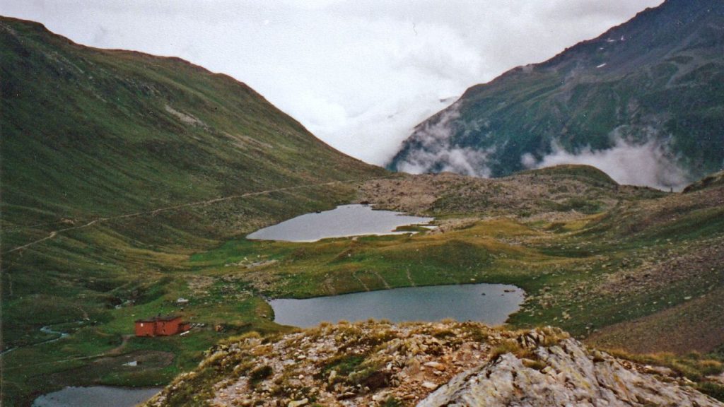 Hinter der Wegbiegung, zwischen den beiden Gipfeln Moton und Motin beginnt es abzutropfen und beim Grenzstein auf dem Pass kann man sogar sitzend eine Verschnaufpause machen und das Gummizeug versorgen. Rechts in der Senke ein kleiner See, noch auf Schweizer Boden und ein paar Schritte von hier jenseits einer Krete in einer Mulde auf der italienischen Seite ein anderer. Gut die Hälfte seiner auf der Karte eingezeichneten Grösse ist grün und verlandet. Kühe weiden dort auf der Alp, welche sich sanft den drei Seen im Val Viola auf der italienischen Seite zuneigt. Der grösste von ihnen ist der Lago di Val Viola.