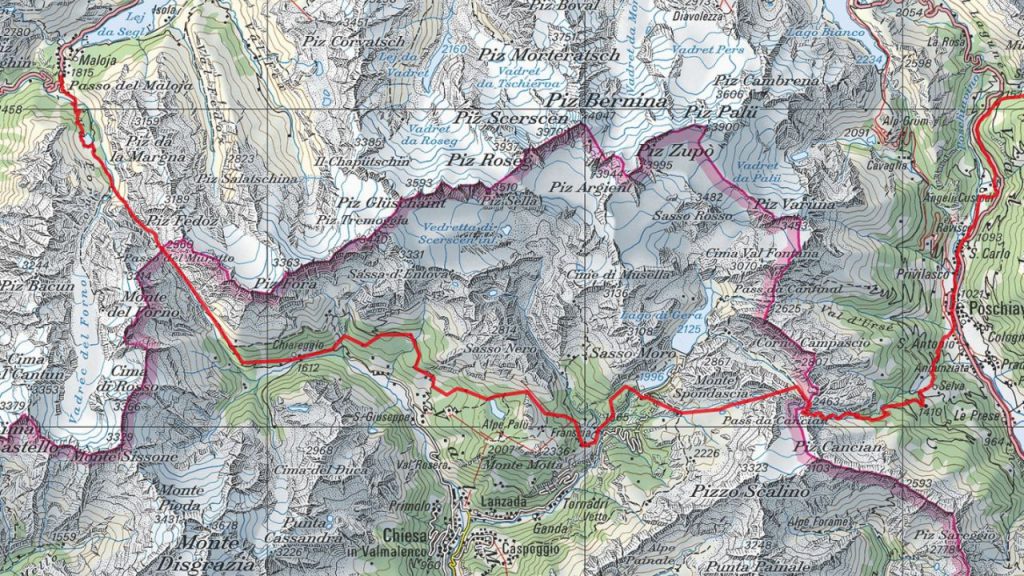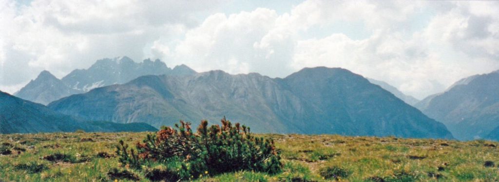 Es ist sehr ruhig. Ausser den beiden jungen Frauen, welche ich auch im Postauto getroffen habe, und die ein gutes Stück vor mir sind, trifft man keine Menschenseele weit und breit. Auch kein Steinbock und keine Schlange. Ab und zu ein Vogel, der durch die Lüfte kreist. Aber mir gefällt diese Stille. Schon geht es gegen Mittag und der Weg führt über ein etwas flacheres Gelände am Munt la Schera vorbei. Von hier aus könnte man einen Abstecher machen um die Aussicht auf dem Gipfel zu geniessen, aber ich bin um die bereits bezwungenen 410 Höhenmeter schon stolz genug. Man sieht hier ins Tal hinunter Richtung Livigno, den Lago di Livigno und hinüber zur Bernina. Hinter den hohen Bergen, welche mir gerade gegenüber liegen sind wir noch am Mittwoch durchs Val de Camp und Val Viola gewandert. Aus dieser Perspektive sieht es gerade gewaltig aus.