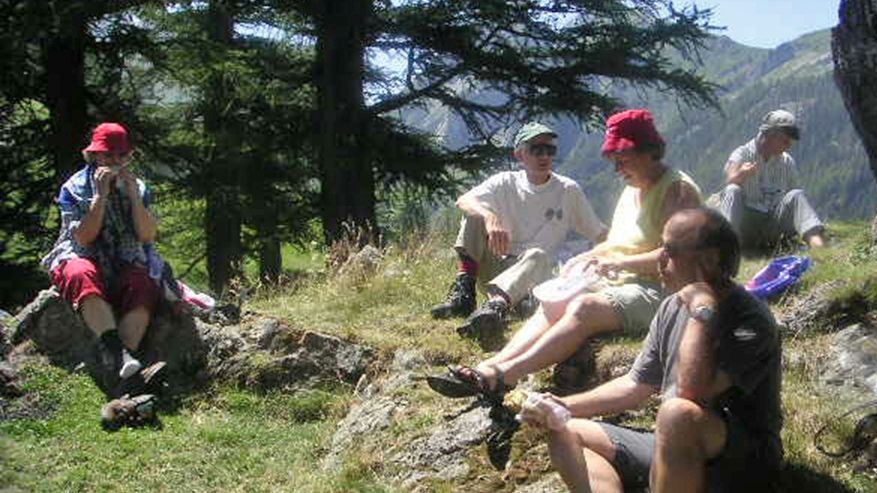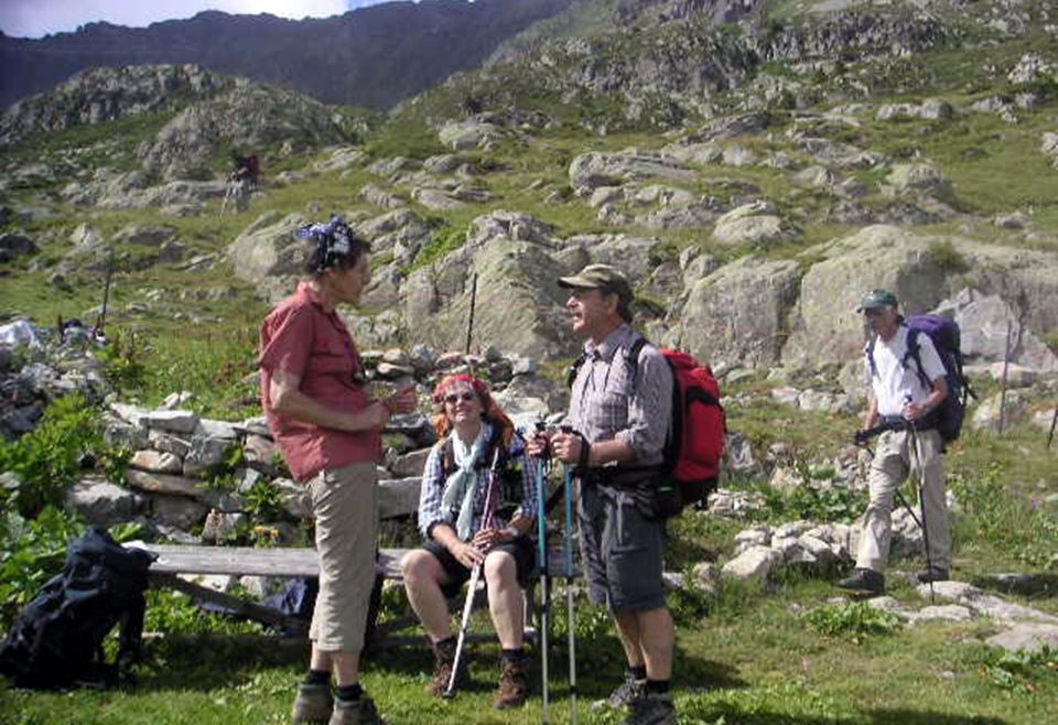 Auf Kuhhöhe wird dann erst Halt gemacht. Eine Schulter muss gepflegt werden. Ich habe nicht bemerkt, dass Marie-Louise gestürzt ist. Eine verknackte Schulter und ein 5-Tages-Rucksack! Das Grüppchen, das den zweiten Pass nicht mehr erklettern will, wird grösser. Die Strecke dem Bach entlang hinunter nach le Tretien oder Finnhaut ist nicht unbedingt kürzer, jedoch geht es viel sanfter und vorwiegend abwärts. Liselotte, Lykke-Lise und Margrit schliessen sich Marie-Louise an und auf der Höhe von genau 2000 Metern trennen sich unsere Wege.