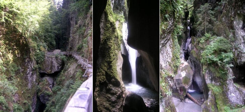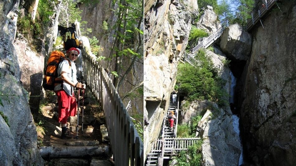 Ein kleines Stück geht’s der Bisse entlang, die eisiges Wasser über vier Kilometer vom Trientgletscher herüberführt. Dann geht’s nur noch abwärts. Zum Glück im schattigen Wald. Warum auch das Wallis überall so steil sein muss! In Trient unten wird es etwas angenehmer, aber nur bis wir uns wieder auf der Strasse befinden, wo man wegen dem Verkehr fast um sein Leben fürchten muss. Am Tête Noire befindet sich eine Postautohaltestelle und hier wird die Abfahrtszeit nun genau inspiziert, bevor man sich wieder in die Tiefe stürzt. Immer weiter über Treppen und Zickzackweglein hinab. Und das müssen wir alles wieder hinauf! Ob das meine Puste aushält? Soll ich umkehren, damit es mir sicher aufs Postauto reicht? Aber doch nicht, ohne meine Nase in die Schlucht gesteckt zu haben! Sogar eine mysteriöse und erst noch eine Grotte der Nymphen ist zu sehen.