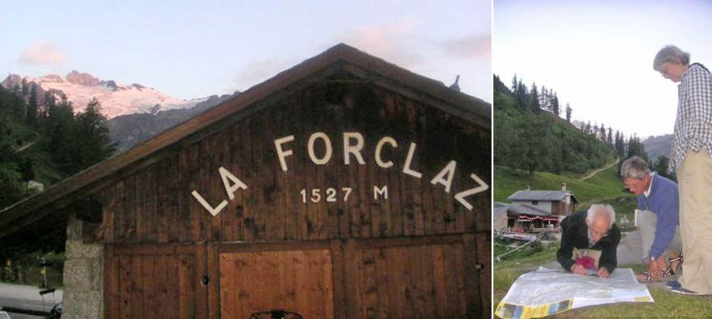 Die fünf Frauen, die auch mit uns im Col de La Forclaz übernachtet haben, erscheinen ebenfalls auf der Bildfläche. So gesprächig sie gestern während dem Essen waren, uns gegenüber verhalten sie sich zurückhaltend. Dass sie heute nach Salvan gehen, können wir ihnen gerade noch entlocken, dabei möchte Esti von ihnen noch viel mehr wissen. „Also dann im Café in La Crêta“. Sie verschwinden aber in der entgegengesetzten Richtung, als die, die wir eine Weile später unter die Füsse nehmen. In Esti als passionierter Orientierungsläuferin haben wir natürlich die perfekte Pfadfinderin und Kartenleserin mit uns. Uns passiert es nicht so schnell, dass wir die falsche Route erwischen. Tatsächlich holen uns die fünf erst wieder ein, als wir schon unsern ganzen Lunch vertilgt haben und schon am Kauen des Zwetschgensteins sind, den uns Hans aus seinem Gedankenbüchlein vorgelesen hat. „Was ist eigentlich Kunst?“ Man befindet sich mitten in einer ernsthaften Diskussion. Perplex und fast ungläubig, dass wir schon hier sind, passieren die fünf Frauen schweigend und verschwinden in der Tiefe. Hier beginnt nämlich der grosse Abstieg von 1845 auf 707 Meter unten am Fluss Le Trient. Zum Glück alles wieder durch den Wald, ausser bei La Crêta, wo uns hoffentlich ein Café wartet.
