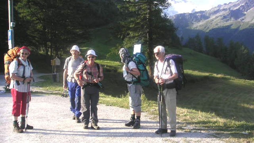 Auch unsere heutige Route beginnt auf einer Staumauer. Nicht alle jedoch mit Vollpackung. Marie-Louises Entschluss ist gefasst. Sie bricht ab. Ihr Arm behindert sie nun doch zu sehr. Auch Liselotte will uns nur noch bis ennet der Mauer begleiten, dann werden beide im Postauto nach hause reisen. Liselotte meldete noch vor dem Abmarsch im Hotel Belle Vue zwei Personen ab. Statt neun wären wir sieben. Die Wirtin tut ahnungslos und behauptet, dass sie schon alles bereit gemacht hätte für 14! Diese Zahl wurde jedoch bestimmt noch vor ein paar Tagen von Esti korrigiert.