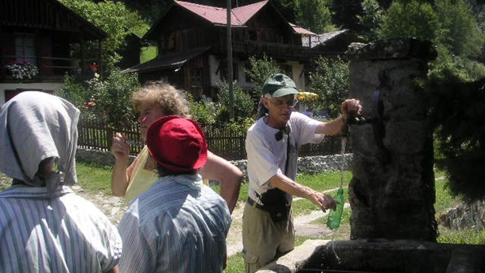 Die Knie schlottern schon recht und die ersten Blasen quälen bereits, als endlich die Dächer von La Crêta zwischen den Tannen in Sicht kommen. Eine friedlich schlummernde Oase hoch über steilen Felsbändern, ein kleines Älpchen im Sonnenschein. Bunte Schirme und Sonnenanbeterinnen in lieblichen Ferienhausgärtchen, flatternde Fahnen, aber keine, die zu einem Restauräntchen gehören. Nichts ist mit einem Kaffee. Einzig ein Brunnen vor dem Gemeindehaus, wo auf einem Balkon eine Kirchenglocke installiert ist, spendet herrlich frisches und kühlendes Wasser. Lykke-Lises Blase wird von Hans vorerst kunstvoll verarztet. Im Hotel folgt dann später der zweite Teil der Operation.