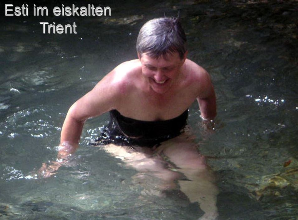 Von unten tönt immer lauter und verlockender das Rauschen des Baches herauf. Esti wird immer schneller und schneller. Magisch zieht das Wasser sie an. Will ich ein Foto vom versprochenen Bad, muss ich mich auch beeilen. Wir wollen beim Brücklein auf die Andern warten. Esti hat sich schon ins Badkleid gestürzt und tut es dem Labrador nach, der eben gerade hier auch dasselbe tat. Unter dem Brücklein hat es eine etwas tiefere Stelle, wo man sogar richtig untertauchen kann. Man, das heisst Esti. Ich bin vollauf zufrieden mit einem Fussbad. Das Wasser ist nämlich eisig. Mich tschuderets vom blossen Zusehen. Hans, Lykke-Lise und Knud haben uns inzwischen eingeholt und nehmen gerade den Aufstieg in Angriff. Sie wollen ihre Füsse nicht zischen sehen.