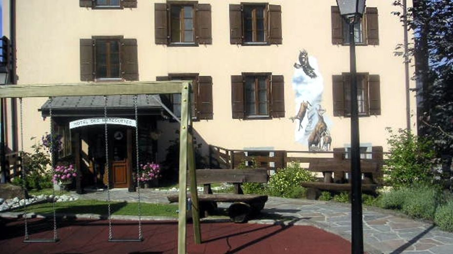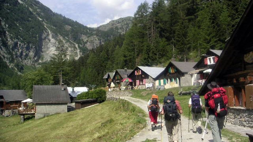 Die Füsse abgekühlt und vom Sand befreit, wieder in den schweren Schuhen steckend, geht’s von jetzt an wieder bergauf. Les Marécottes liegt auf 1110 Meter. Das sind also volle vierhundert Meter, fast Diretissima. Irgendwo wäre hier noch eine Höhle oder eine Schlucht zu besichtigen. Aber unser Sinn steht nur noch nach einem kühlen Bier und dabei die Füsse hochzulagern. Langsam und immer langsamer gewinnen wir an Höhe. Endlich kommen erste Anzeichen von besiedeltem Gebiet. Ein zu einem Ferienhäuschen umgebauter Stadel, dessen vier Ecken richtig walliserisch auf vier Pfosten ruhen, welche mit einer runden Steinplatte gekrönt sind. Dann stehen wir plötzlich in einem Zeltplatz. Liebevoll gehegte und gepflegte Miniaturgärtchen, wo es grünt und blüht, als gelte es einen Wettbewerb zu gewinnen. Ein letztes Doping für Marie-Louise aus der Wasserflasche und endlich geht’s die letzten paar hundert Meter nur noch geradeaus.