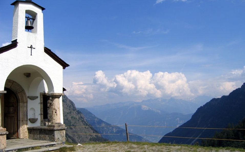 Dafür ist das Gewitter inzwischen weitergezogen und weisse Wolkenkugeln kullern über die Gletscher und Täler des gegenüberliegenden Mont Blanc Massivs. Die Sonne begleitet mich sogar schon wieder auf meine Wallfahrt hinauf zur Kapelle, die auch hier auf einem kleinen Hügel über der Staumauer errichtet wurde. Vom geschmolzenen Wachs der vielen Kerzen duftet es fast wie Weihnachten, dabei leuchten durch alle Fenster Blumen aus farbigem Glas gearbeitet. Zu den vielen brennenden Kerzlein gesellen sich auch ein paar von uns. Man erwartet dafür, dass man einen Franken ins Kässeli legt, das ganze Portemonnaie hier zu lassen, ist bestimmt leicht übertrieben. Zum Glück kennt Esti die Besitzerin.