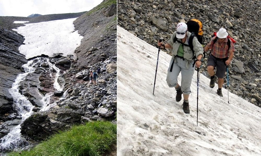 Das Geröllfeld hat für Hans wieder eine unwiderstehliche Anziehungskraft. Wie auf einem Schneefeld rutscht und hüpft und gleitet er in der Direttissima hinunter, magnetisch angezogen von einem verlockenden wirklichen Schneefeld. Wenn der sich nur nicht in den Steinen was bricht! Ich habe Angst um ihn. Das Schneefeld hingegen lockt auch mich. Ich steige nur nicht so hoch ein, wie Hans und Esti. Diesen Spass hat mir Hans schon bei unserer ersten Wanderung beigebracht. In einem unten sanft auslaufenden Feld hat man Höhenmeter viel schneller und mit viel mehr Vergnügen überwunden.