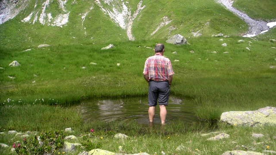 Wir wählen ein winziges Seelein auf einem grünen Zwischenbödeli schon von hier aus als unseren nächsten Rastplatz aus. Rinnsale von klarem Quellwasser sprudeln in Bächlein über Felsen und begleiten unseren Weg. Erfrischend und kalt erlabt es aus der frisch gefüllten Flasche meine durstige Kehle. Die Erquickung für die Füsse muss noch warten bis zum Bödeli. Ob sich all die vielen kirschengrossen Kaulquappen auch über den dampfenden Käsegeruch ergötzen?