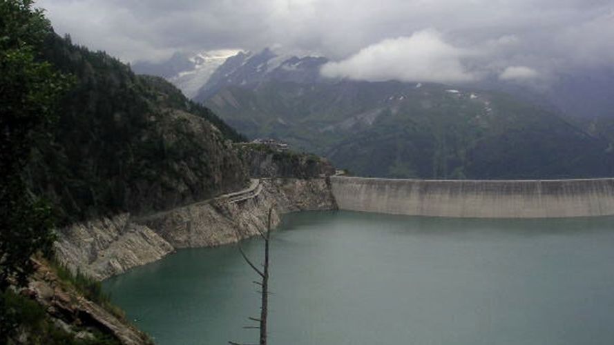 Der Regen konnte sich nun zurückhalten, bis wir schön am Trockenen hinter einem heissen Tee sitzen. Die andern Vier sind noch nicht eingetroffen. Das letzte Postauto ist schon wieder ins Tal gefahren. Aber es gibt noch eine andere Möglichkeit. Von Chatelard führt die steilste Standseilbahn der Welt mit 87% Steigung (in Luzern behaupten sie dies zwar von der Pilatusbahn auch) in die höheren Gefilde dieser Region. Dort kann man in eine Rüttel-Panoramabahn umsteigen, welche von jugendlichen Lockführern nahezu abenteuerlich auf gleichmässiger Höhe dem Berg entlang bis zum Fuss der Staumauer führt. Dieses Bähnli wurde seinerzeit für den Bau der Mauer gebraucht. Den letzten Rest von fast 100 Metern Höhe bewältigt nun noch die Minifunic, die uns nun die vier leider etwas nassen Freunde bringt. Glücklich, wer die exklusive Fahrt trotz dem exklusiven Preis von Fr. 50.- trotzdem geniessen konnte.