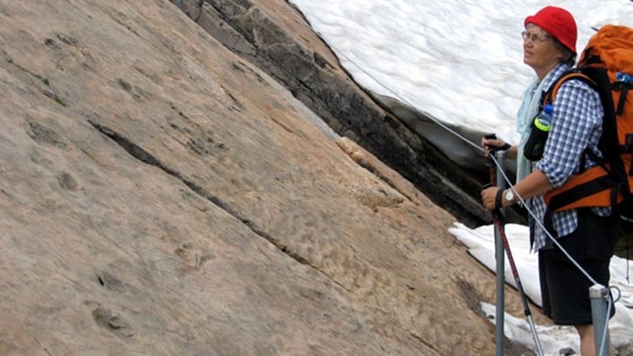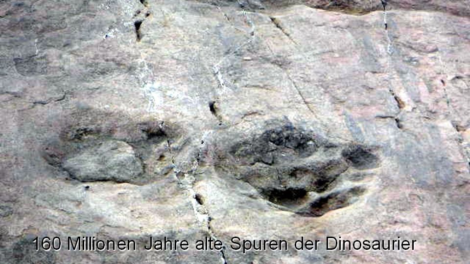 Eine Wissenschaftlerin von einem Museum in Genf ist jeden Tag hier oben und bietet Führungen an. Wäre sicher noch interessant, verstünde man besser französisch. Wir haben jetzt einfach die etwa 20cm grossen Pfoten- oder Tatzenabdrücke dieser 3 – 4½ Meter grossen Saurier, welche eine Schrittlänge von etwa zwei Metern hatten, gebührend fotografiert und suchen uns etwas abseits für unsere Mittagsrast einen trockenen Stein.
