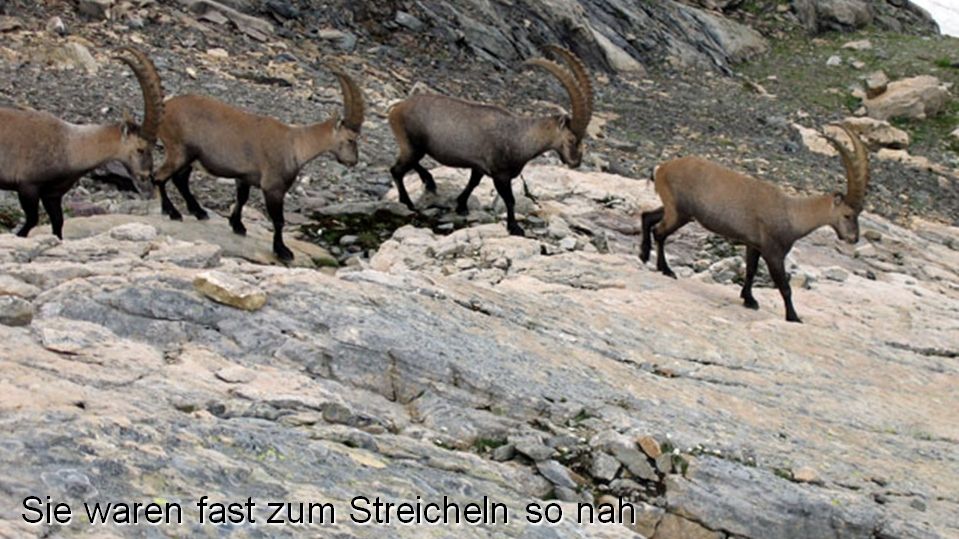Von wegen einer! Zwei, drei klettern auf der Felsnase herum und bieten eine tolle Silhouette. Die Andern weiter vorn sind auch stehen geblieben und schauen gebannt zum Felsen hinüber. Von dort kann man einen ganzen Alpabzug beobachten. Vielleicht 50 Meter entfernt kommen 2 Tiere über eine Krete herunter. Ziemlich genau auf der Schweizergrenze balancierend. Oben im Fels werden wir von etwa 5 weiteren Tieren beobachtet. Eines davon eine Mutter mit einem Jungen. Langsam gehen wir weiter auf der andern Seite, wo ein spektakulärer Bock sich gemächlich Richtung Wanderweg bewegt. Knud und ich gehen leise mit unserem Fotoapparat auf ihn zu. Es sind sicher keine zwanzig Meter Abstand mehr, als ich das Rudel hinter Felsblöcken entdecke. Ein Foto von einem Tier, mit dem Weiss eines Gletschers im Hintergrund gelingt mir. Gemütlich fressend ziehen sie an uns vorbei, hinüber Richtung Steinbockfelsen. Hans sitzt inzwischen ruhig dort drüben und sie lassen sich von ihm nicht stören. Es sind sicher keine 10 Meter, die sie vor seiner Nase passieren.