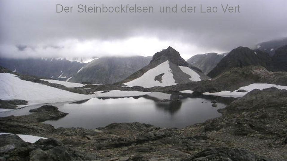 Noch ganz benommen von dem Erlebnis, welches nicht nur für unsere Dänen, sondern bestimmt auch für alle von uns nicht etwas Alltägliches ist, wandern wir auf einem Schneefeld beim Lac Vert vorbei und beinahe verpasst man darob auch diese Schönheit in sich aufzunehmen. Bizarr der Steinbockfelsen, der sich im See spiegelt und darüber die dräuende Wetterwolke. Und schon stehen wir vor dem nächsten Abenteuer. Die Passhöhe ist erreicht und zwischen riesigen Felsbrocken geht’s nur noch in die Tiefe. Der Weg ist kaum auszumachen und fast mit jedem Schritt befindet man sich einen Meter tiefer als zuvor. Man sollte hier besser ein bisschen nahe beieinander bleiben. Gar schnell ist unbedacht ein Stein losgelöst, welcher sich in die Tiefe stürzt. Je weiter sein Weg, desto grösser sein Tempo und selten bleibt einer dabei allein. Bald sind aber über uns andere Wanderer am Absteigen und prompt schallt auch ein warnender Schrei von oben. Zwei drei Steine poltern keine fünf Meter neben mir herunter. Ich habe inzwischen den Weg auf der Grasnarbe erreicht. Im Zickzack von etwa zwei, drei Metern wendet der Weg immer wieder bis man über ein Geröllfeld etwas nach rechts aus der Gefahrenzone heraus kommt.