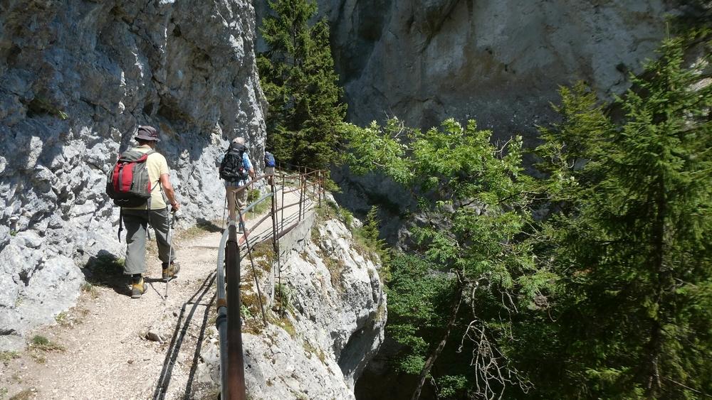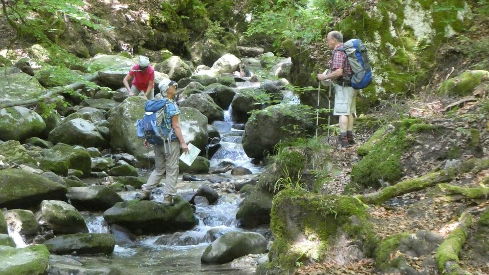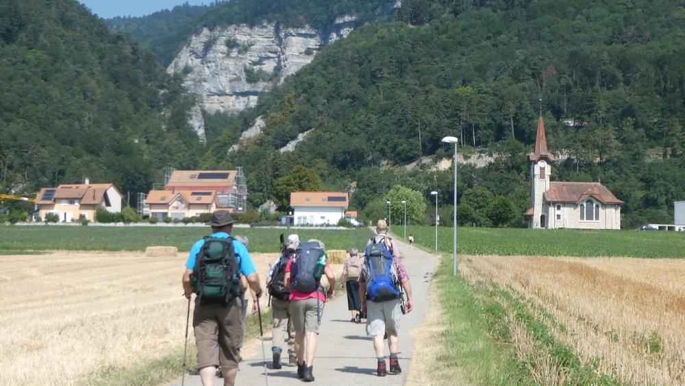 Die Kirche und ein paar Häuser drängen sich dicht zusammen am Fusse des ersten Jurahöhenzugs unter kalkigen Felswänden am Eingang zu einer Schlucht. Gnädig empfangen uns direkt nach dem letzten Haus die Gorges de Cavatanne auf bewaldetem Wanderweg in ihrem Schatten. Langsam aber stetig steigt der Weg bergan und schon bald rauscht das Wasser des Arnons tief unten im engen und ausgeschliffenen Felsenspalt. Dann haben wir aber doch seine Sprungschanze erreicht und ein Weilchen plätschert er friedlich auf fast gleicher Höhe neben uns her.