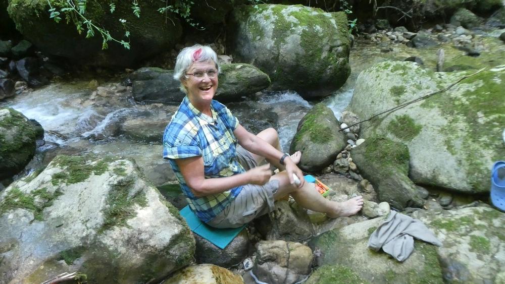 Von seiner kühlenden Nähe wollen wir für unsere Mittagspause profitieren und Esti lenkt ihre und unsere Schritte mitten ins Bachbett, wo wir auf bemoosten Steinen unser Picknick abhalten.