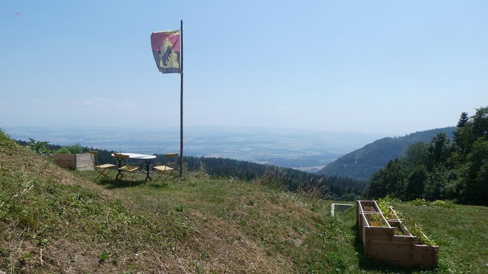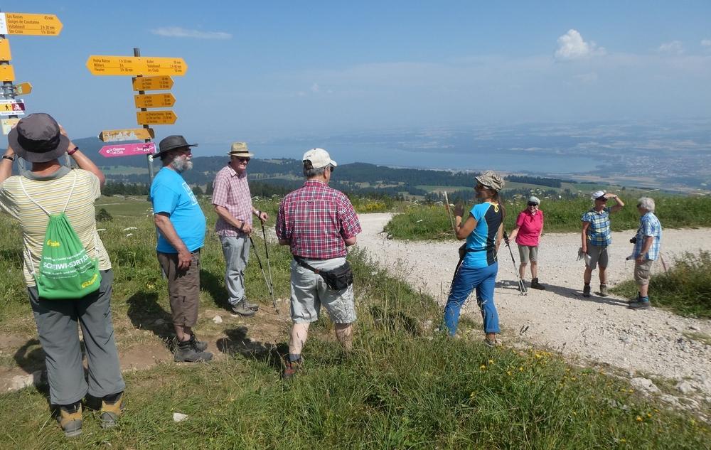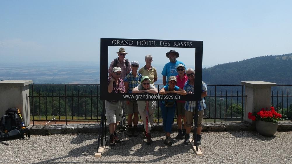 Wieder zurück beim Hotel traue ich meinen Augen kaum – die andern fünf sind eben quietschvergnügt eingetroffen. Sie haben die Zeit von einer Stunde und 10 Minuten auf dem Wegweiser just eingehalten. Ohne Rucksack war‘s doch noch eine Erleichterung und die Hitze drückt immer noch. Mit Panaché und Cidre wird zuallererst nun der Flüssigkeitsbedarf wieder aufgefüllt und dann noch nachgeschaut, was es sonst noch so ‚ums Hus ume‘ zu sehen gibt. Die Aussicht vom Zimmer ist fantastisch. Über den Balcon du Jura hinweg, wo sich Sainte Croix und Les Rasses auf etwa 1000 Metern ausbreiten, sieht man das Ende des Neuenburgersees mit Yverdon und dahinter ins Freiburger- und Wadtland, wo der Horizont im weissen Dunst verschwindet, ohne die Silhouetten der Alpen mit ihren Spitzen aus ewigem Schnee zu enthüllen.