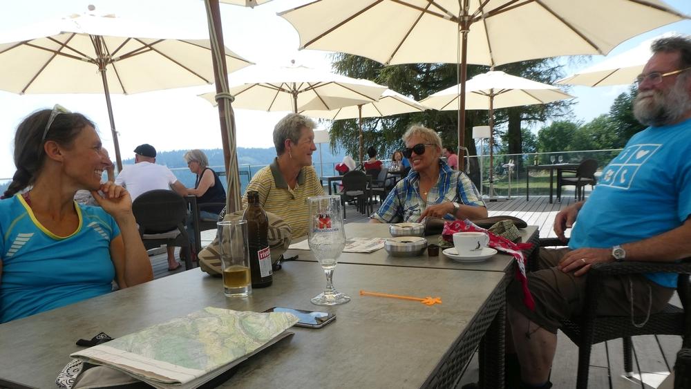 Fondue au Mauler, Spezialität des Hauses steht auf der Speisekarte. Wer‘s kennt, weiss dass Mauler ein Schaumwein ist, also ein Sekt-Fondue – bei dieser Hitze? Das überlassen wir den andern! Für uns gibt’s anderes Währschaftes: Croûte au fromage oder Tomme poêlée, paniert und gebraten auf Rösti, genau recht nach unseren Anstrengungen.