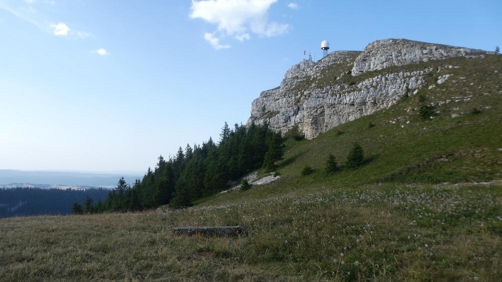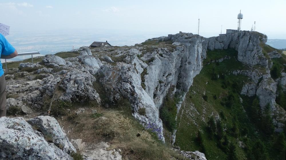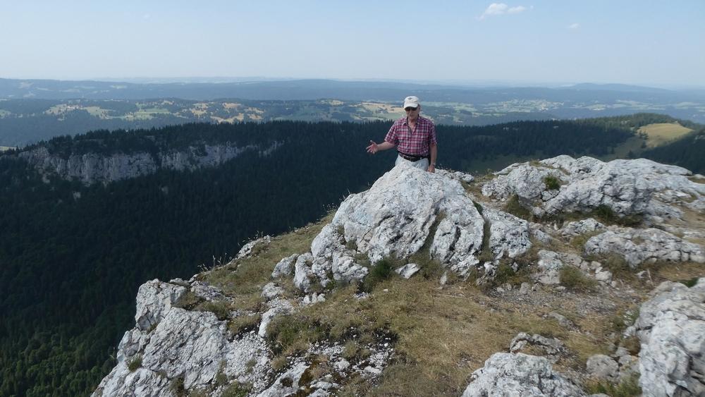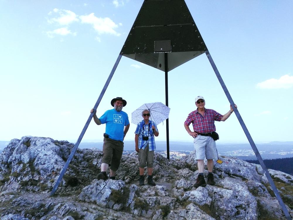 Zimmerbeziehen wollen wir erst, wenn alle da sind und noch mehr als alles andere reizt jetzt trotz allem der Triangulationspunkt auf dem Gipfel. Es sind nur noch etwa dreissig Höhenmeter und ohne Rucksack am Buckel schafft man dies geradezu leichtfüssig. Ziemlich senkrecht bis fast überhängend fällt die Nordseite des Chasserons mit hohen Felsbändern ab und gibt den Blick Richtung Pontarlier über die nahe Schweizergrenze bis weit nach Frankreich frei. Der erste Gipfel auf unserer Wanderung und ich versuche gerade mein Glück, für Hans ein aktuelles Handyfoto der Gipfelstürmer mit dem PostCartCreator zu schicken.