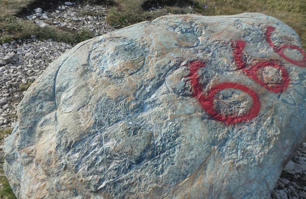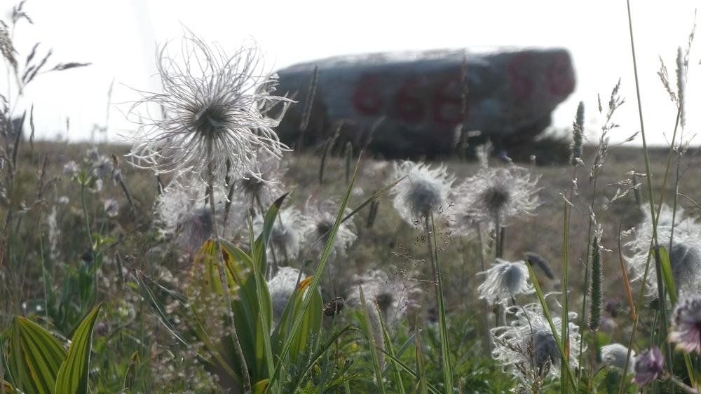Hinter dem Haus kündet ein Wegweiser in ein paar Schritten den „Pierre de la Paix“, den Friedensstein an. Er soll dort auf dem Plateau des Chasserons einen Kraftort markieren. Neugierig gehe ich auf die Suche und bald liegt dieser grosse, ovale Granitstein in der glänzenden Abendsonne verlassen auf einer Wiese vor mir. Die Symbole der verschiedenen Religionen sind auf seiner fast glattgeschliffenen Oberfläche zu sehen. Selber bin ich wohl zu unsensibel, auf dass ich hier bei diesem irgendwelche wundersamen Dinge spüren könnte. Gemäss einem Touristenpro-spekt sollen sich hier drei geomantische Kraftlinien kreuzen, welche bei der Messung Energien von bis zu 70‘000 Bovis-Einheiten verströmen. Fast elektrisierend mutet mich allerdings das Bild der vielen ‚Chutzbuebe‘ der Schwefelanemonen im Gegenlicht der Abendsonne an. Silbrig glänzen ihre wirren Wuschelköpfe, als ob sie diejenigen wären, welche die hiesigen Energieströme kurzschliessen würden.